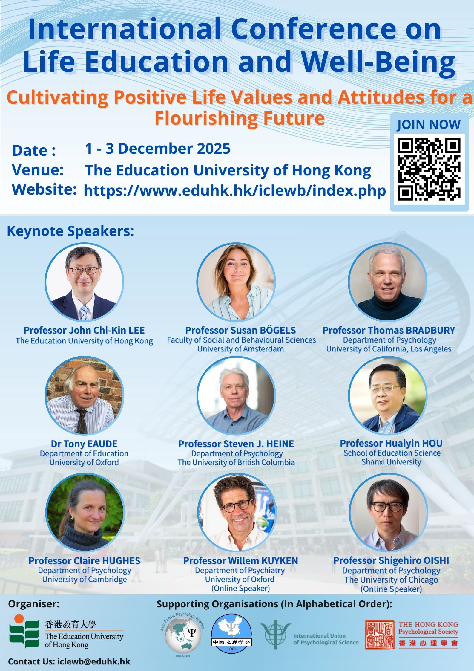 The Education University of Hong Kong is organising the International Conference on Life Education and Well-Being (ICLEWB 2025). The conference will take place between 1 and 3 December 2025, on the University’s campus. Additionally, post-conference workshops will also be held on campus on 4 December 2025.