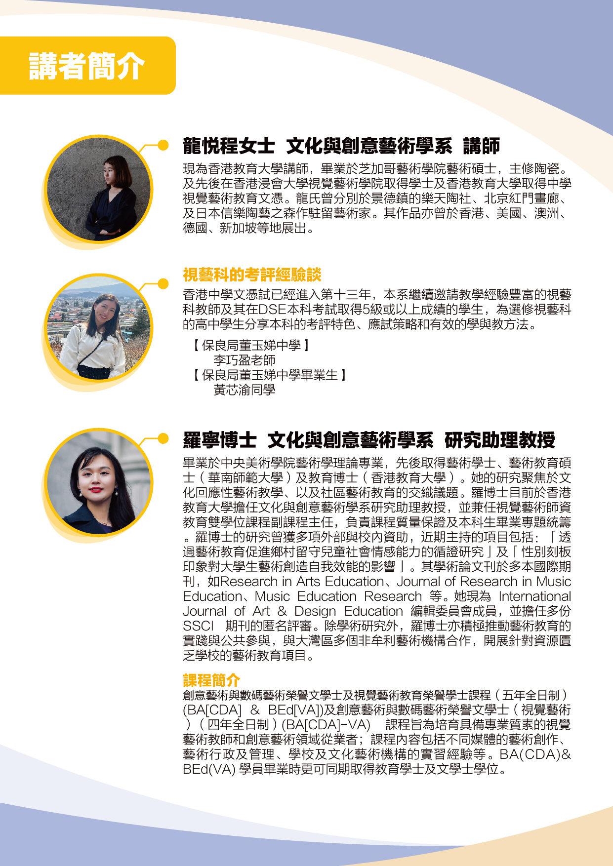 香港教育大学文化与创意艺术学系自2012年开始举办新高中视觉艺术科作品展览及讲座,为教师及学生提供一个交流平台,获得不少正面回响。为进一步拓展高中选修视艺科学生的视野,本系将举行一场缐上讲座,为师生提供视觉艺术科之应试策略及升学资讯。讲座分为两部分,首部分为课程介绍,次部分为中学视艺科老师及在DSE取得5级或以上成绩的学生分享心得。