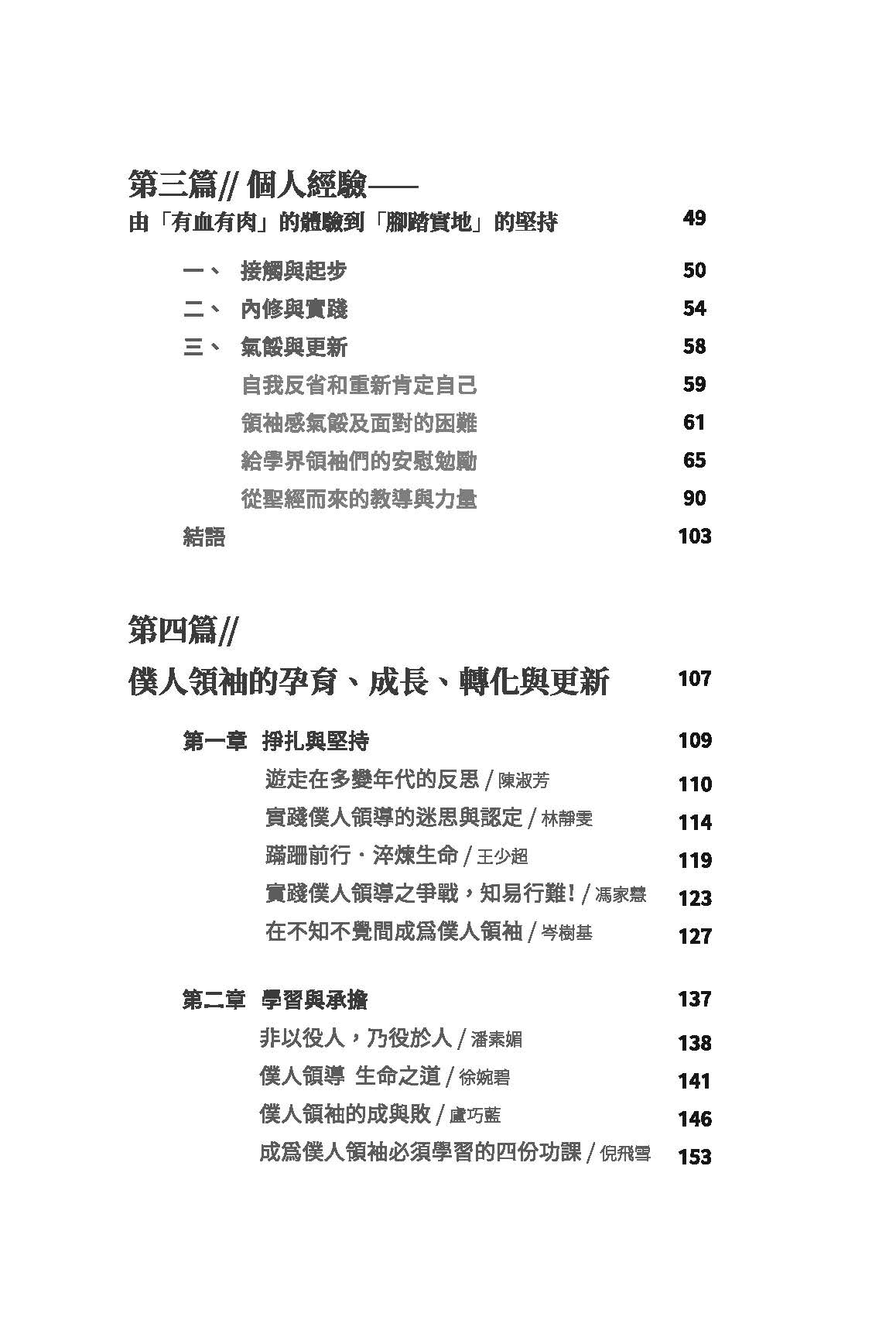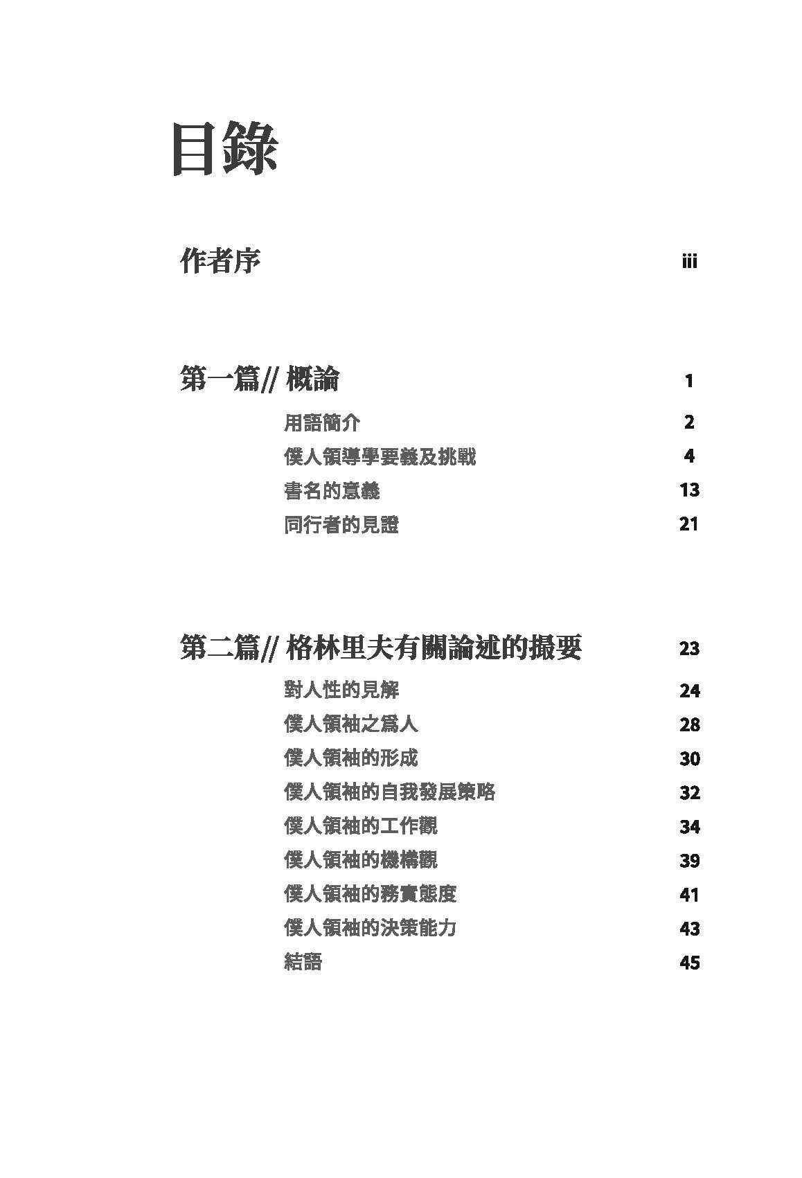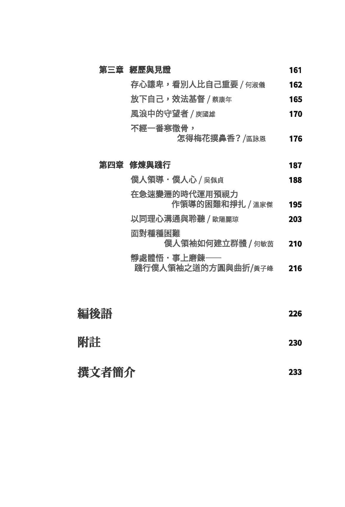 • 全書共七章,包括「僕人領袖語錄」、「行為/習慣」,「可能之誤區」、「比喻」、「經文」、「禱文」及「詩歌」共365則,幫助讀者全面反思自己是否表裏一致,從中學習而得以成長。