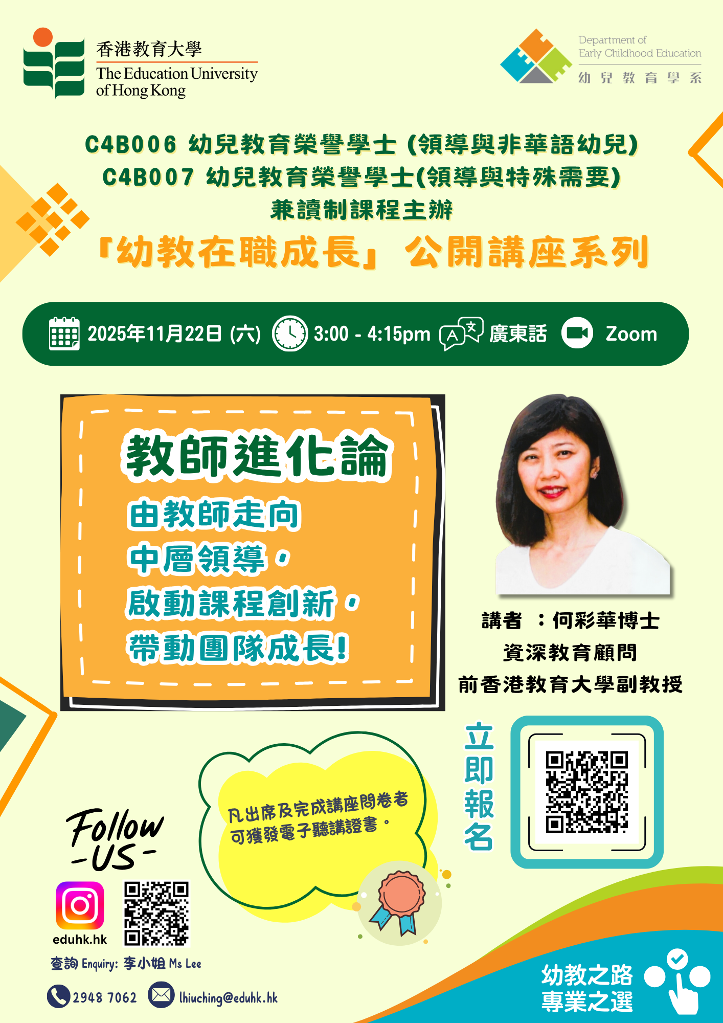 The Department of Early Childhood Education at EdUHK will organise the public lecture series titled "Professional Growth in Early Childhood Education". The lecture series will feature different industry experts, who will share and elaborate various topics related to early childhood education. The content of these lectures is interesting and practical, and it can also facilitate early childhood educators, students, parents, and individuals who are looking further education to learn about techniques and practical skills that can aid in the growth and learning of young children.
