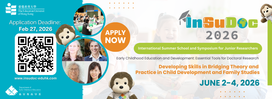 The Department of Early Childhood Education at The Education University of Hong Kong (EdUHK) is pleased to announce that the4th International Summer School and Symposium for Junior Researchers (InSuDoc 2026) will take place from 2-4 June 2026 in Hong Kong.