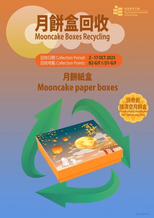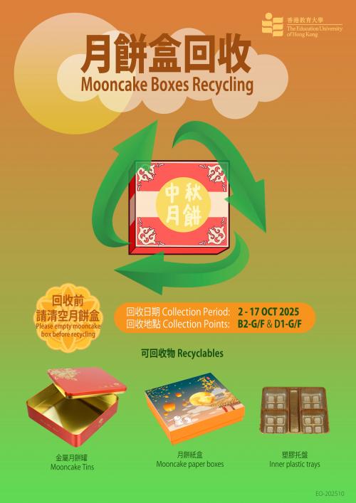 After the Mid-Autumn Festival, there are probably some empty mooncake boxes left at your homes. Instead of disposing of them into the landfills, please consider upcycling the boxes, such as transforming them into storage boxes. Another green alternative is to recycle them. Two mooncake box recycling points at B2-G/F and D1-G/F are set up between 2nd and 17th October 2025 for collecting unwanted mooncake tins/paper boxes as well as inner plastic trays.