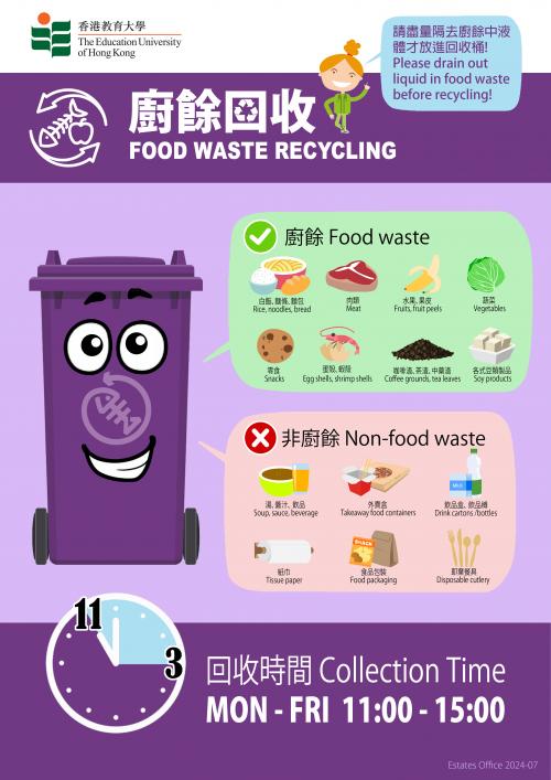 To encourage food waste recycling, three food waste recycling spots have been set up in the following locations during lunch hours from 11:00 am to 3:00 pm on every Monday to Friday (except public holidays):