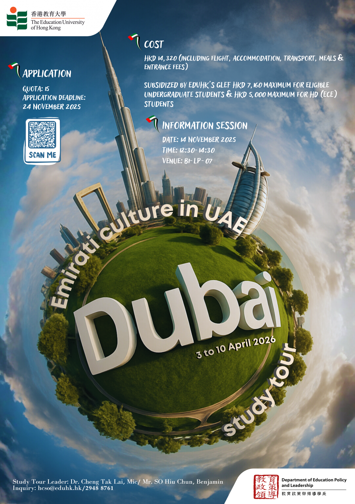 We are excited to announce that the Department of Education Policy and Leadership (EPL) will organize a GLEF study tour to Dubai during Easter 2026. The tour, themed 'Emirati Culture in UAE,' will take place from April 3 to April 10, 2026.