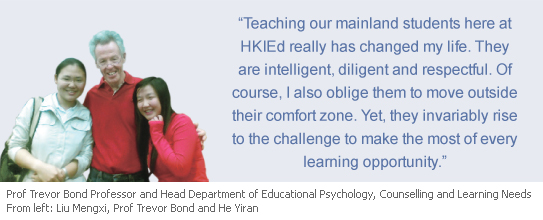 I am deeply touched by many people and events at the HKIEd. Citing two examples: when I spent my first Mid-Autumn Festival in Hong Kong, I was really homesick. It was very kind and thoughtful of Prof Trevor Bond to invite the Mainland students to spend the Festival at his home. Everyone was very happy that night. I put aside my pensive mood as well and joined everybody in having a good time. Secondly, I must mention Dr Philip Hoare. I have learnt a great deal from his very thorough teaching methods. At regular meetings with us, he asks us to tell him all about the new words we have learnt and then he gives us ample opportunities to practise our English. He also cares about how well we are adapting to the new learning environment. I treasure these regular “appointments” with him very much indeed.