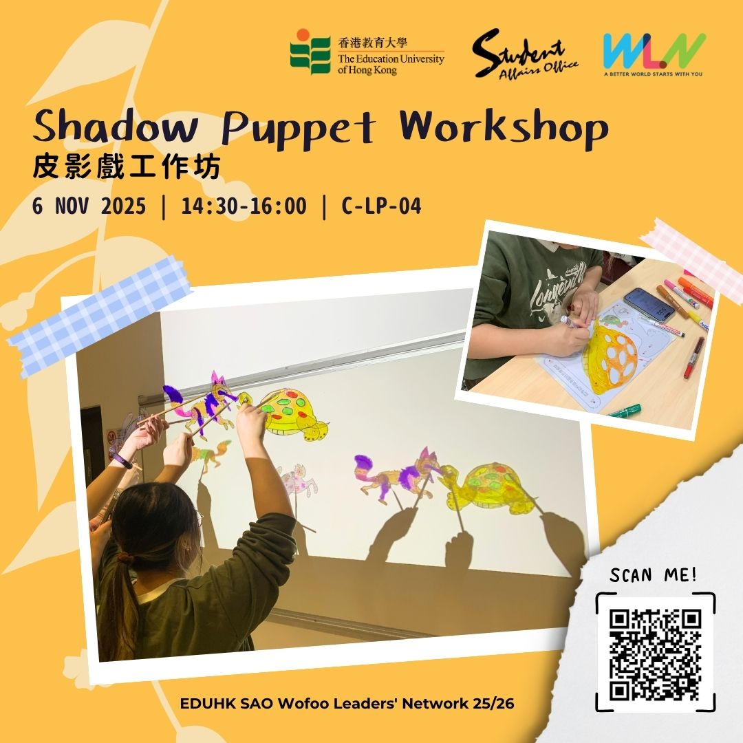 和富領袖網絡為大家帶來皮影戲工作坊! 你將有機會發揮創意,親手製作專屬你的彷皮皮影戲偶,學習皮影戲偶的操作技巧,掌握光影與聲音的結合,演一場屬於自己的皮影戲。同學完成後可以把作品帶走。