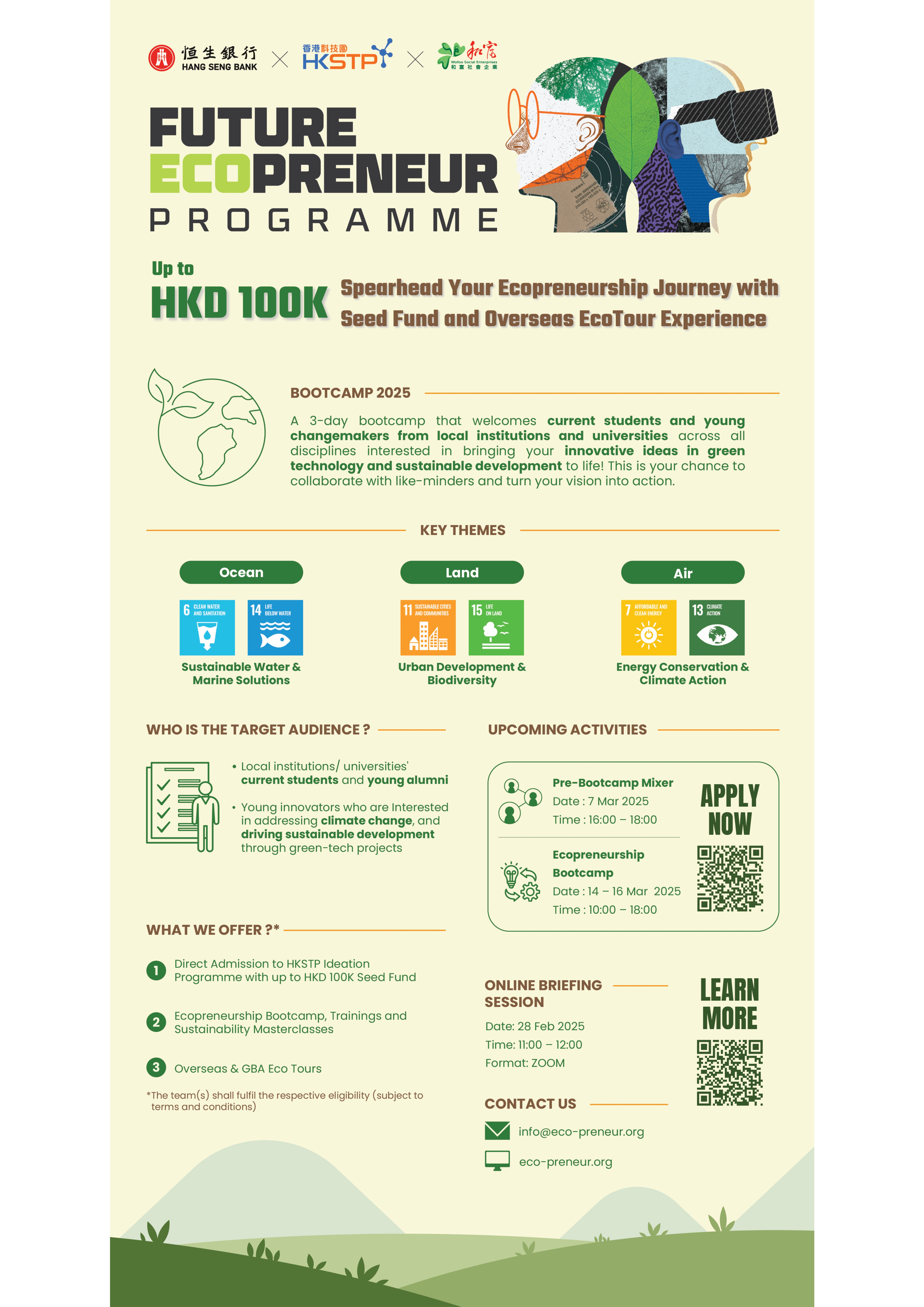 Hang Seng x HKSTP x Wofoo: Future Ecopreneur Programme is offering a 3-day bootcamp that welcomes current students and young changemakers from local institutions and universities across all disciplines interested in bringing innovative ideas in green technology and sustainable development to life. This is a great chance to collaborate with like-minders and turn vision into action.