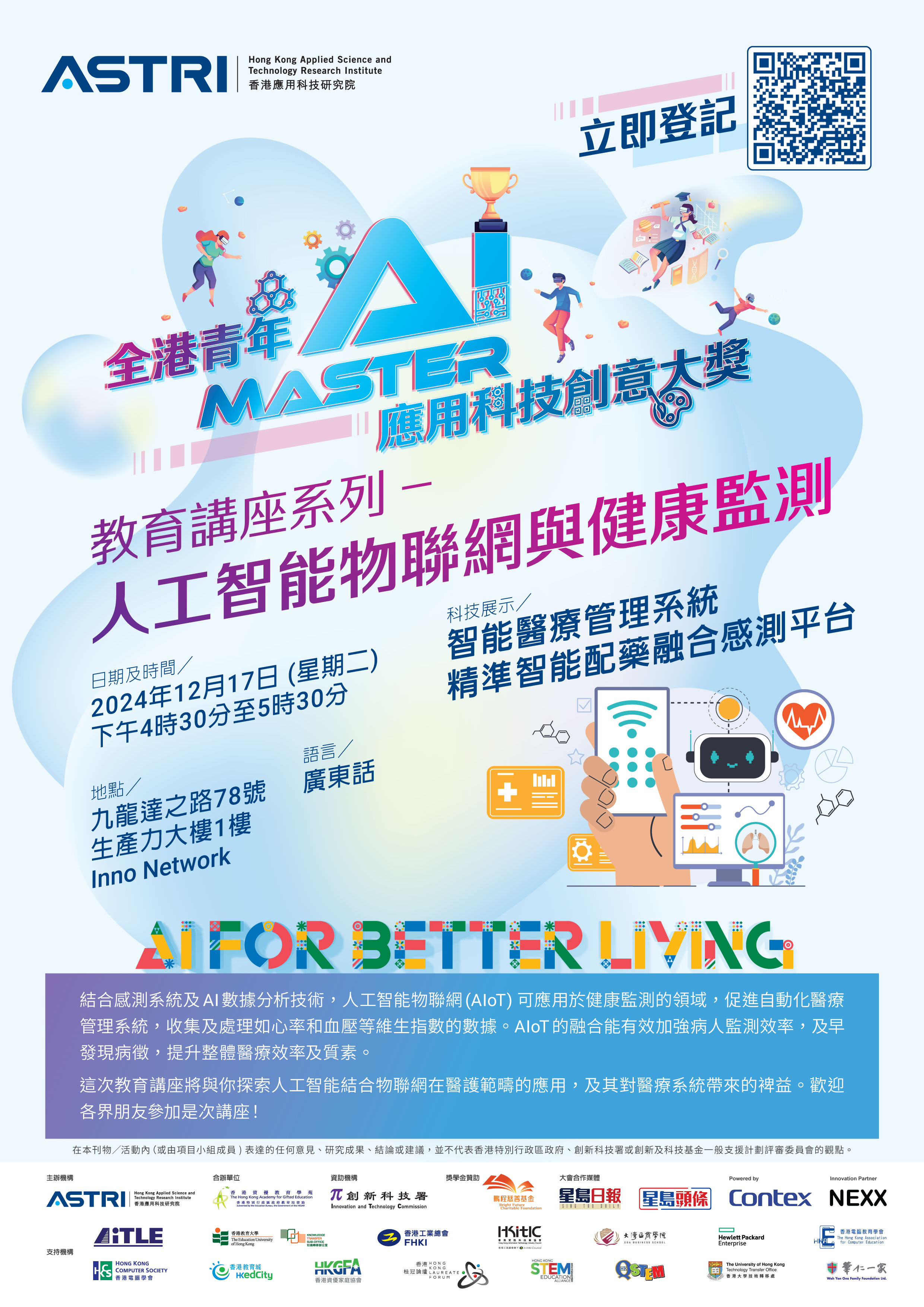 香港应用科技研究院(应科院)为《全港青年AI Master应用科技创意大奖》举办的教育讲座系列,下一场将于12月17日举行,主题为「人工智能物联网与健康监测」。这次讲座将会深入探讨AI和物联网如何应用于医护范畴,提升医疗服务效率。无论是否有意参赛的中学生,或者希望了解AI科技的朋友,均欢迎免费报名参加,认识最新的AI应用!