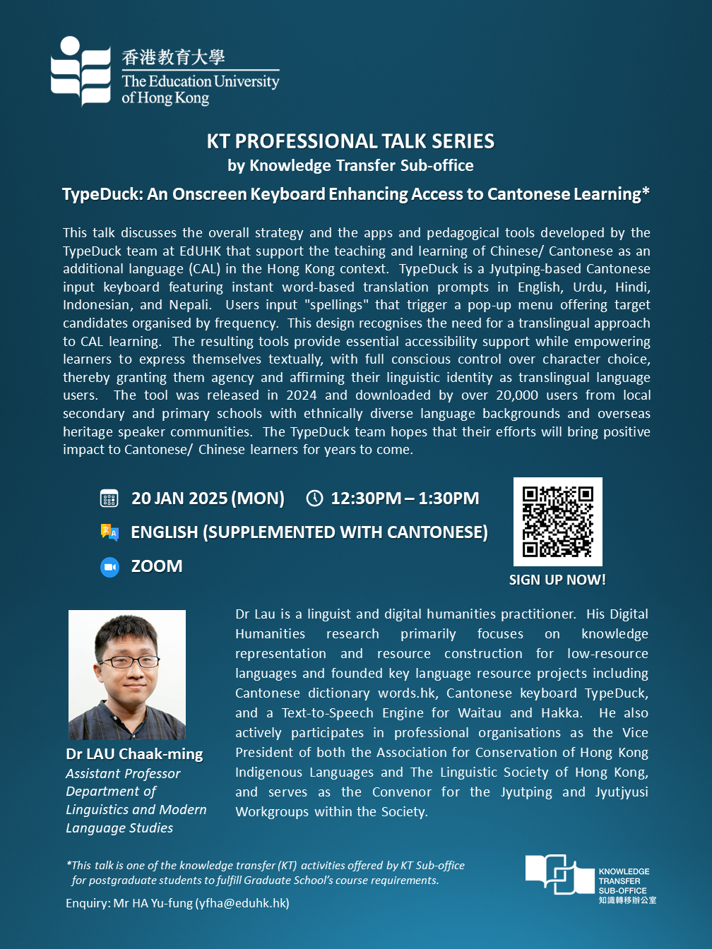 Knowledge Transfer Professional Talk Series - TypeDuck: An Onscreen Keyboard Enhancing Access to Cantonese Learning (20 January 2025, 12:30PM - 1:30PM)