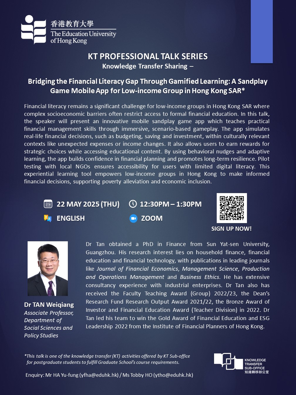 KT Professional Talk Series – Bridging the Financial Literacy Gap Through Gamified Learning: A Sandplay Game Mobile App for Low-income Group in Hong Kong SAR (22 May 2025, 12:30PM - 1:30PM)