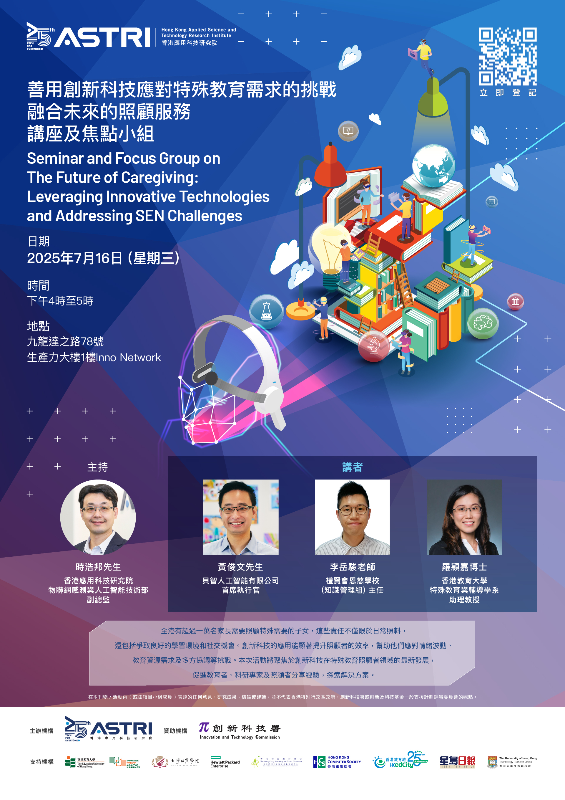 香港应用科技研究院(应科院)将于7月16日(星期三)举办《善用创新科技应对特殊教育需求的挑战,融合未来的护理服务》讲座及焦点小组活动,是次活动将聚焦于创新科技在特殊教育照顾者领域的最新发展,促进教育者、科研专家及照顾者分享经验。