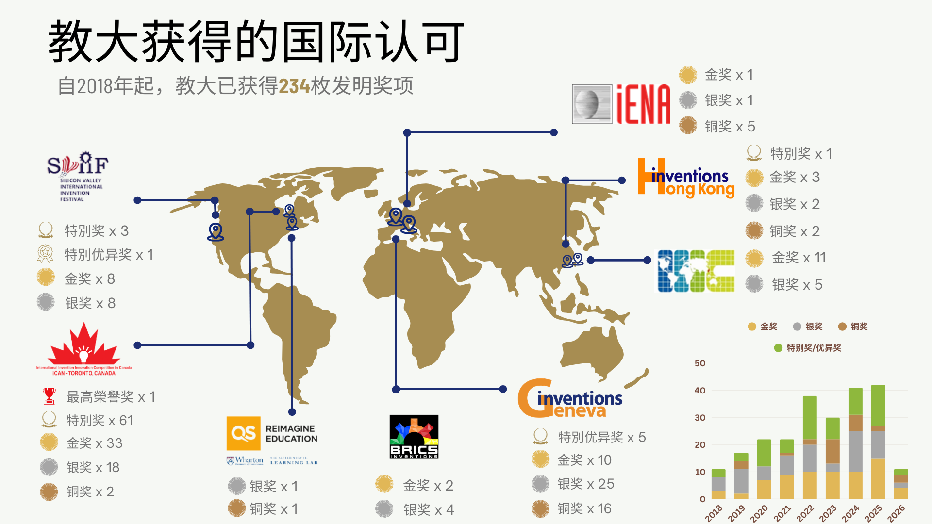 教大发明以教育为本,由2018年至今,已荣获234个奖项,证明教大发明备受国际肯定。