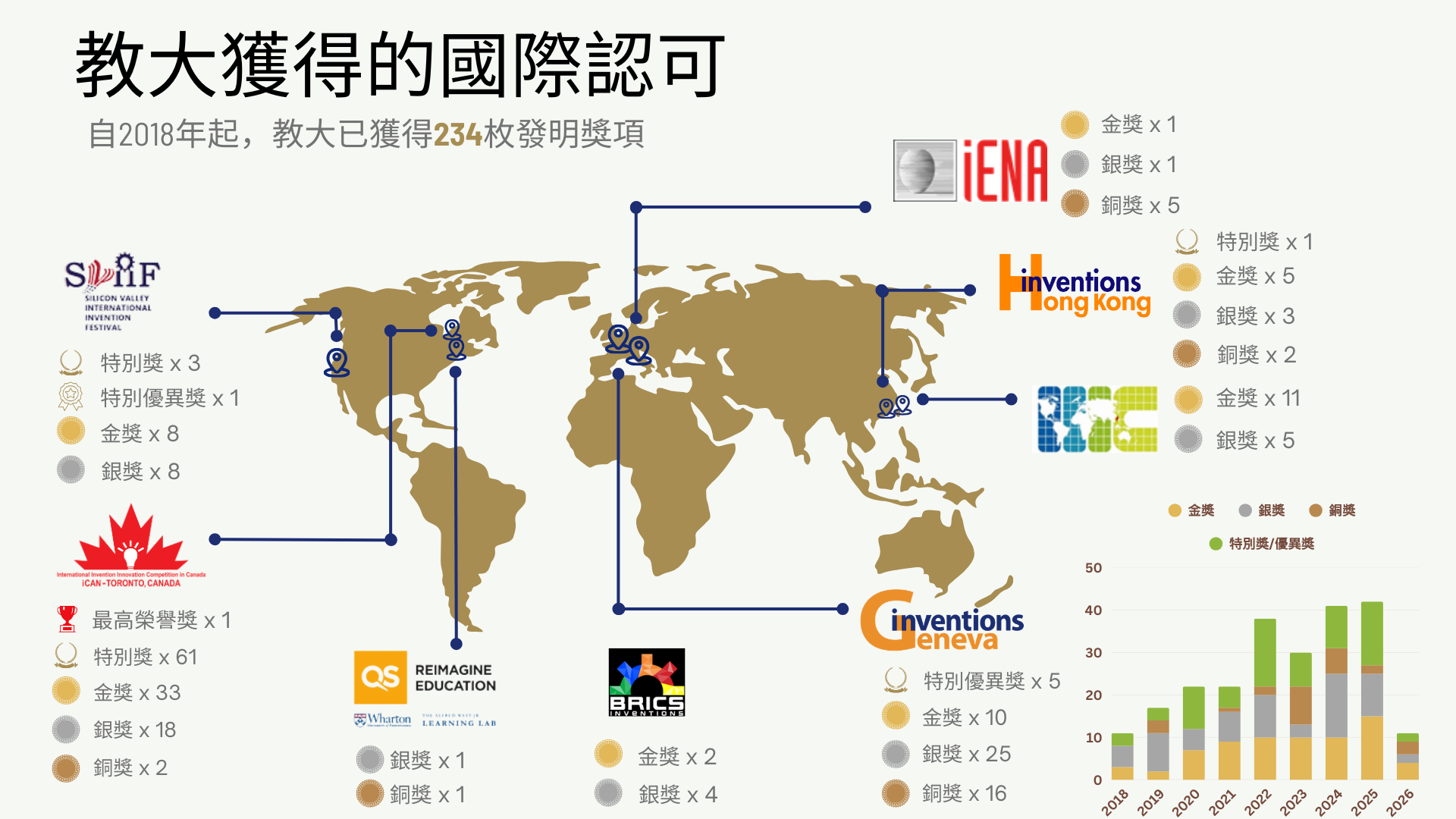 教大發明以教育為本,由2018年至今,已榮獲234個獎項,證明教大發明備受國際肯定。