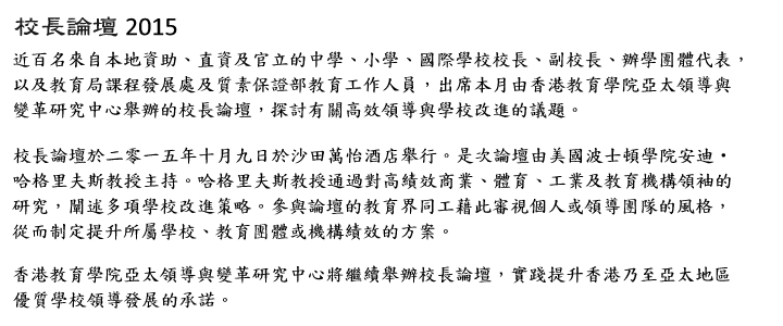 Around 100 Educational leaders from aided, government, direct subsidy and international schools, school sponsoring bodies as well as the Curriculum Development Institute and Quality Assurance Division of the Education Bureau came to the School Principal Forum organized by the Asia Pacific Centre for Leadership and Change (APCLC) to discuss high impact leadership and school improvement. The Forum was held on Oct 9 at the Marriott Courtyard Hotel. Participants engaged with Chair Professor Andy Hargreaves of Boston College who presented improvement strategies informed by research in high performing organisations from across business, sport, industrial and education sectors. The forum allowed participants to identify approaches to support higher achievement in their own organisations. ![]()