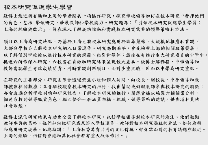 Dr. Qian Haiyan embarked on a collaborative study between academics in Hong Kong and Shanghai Dr Qian recently embarked on a collaborative study between academics in Hong Kong and Shanghai to investigate how school leaders perform their roles to lead school-based research and develop teacher and school capacity. Titled “Leading school-based research to improve student learning: Lessons from Shanghai”, the study aims to identify and analyze the key roles of school leaders in leading school-based research to improve student learning, build an in-depth understanding of the leadership strategies and practices associated with the successful promotion and implementation of school-based research.