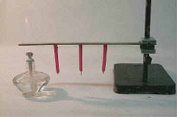 | 要數分鐘才可把所有蠟燭黏在金屬棒上,而把金屬棒夾在支架上時亦要很小心,否則蠟燭很容易掉下來。 | 只需用木夾就可輕易把溫度傳感器夾在金屬棒上。 |
