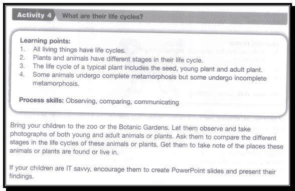 Figure 6. Taken from I-Science Parent’s Guide Primary 3 & 4. Theme: Cycles, Chapter 1: The Cycle of Life, Activity 5: How many stages are there in their life cycles? (Page 41) [Source: Lee, A. N. (2008)]