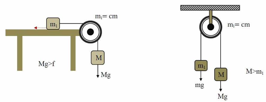 Here for the pulley mass the value of c =1/2 (constant), and mi = 1/2 m=cm. By this definition the total mass motion can be determined easily. In order to know the application of the total mass strategy, the problem in a plane, a hanging pulley and an elevated plane will be considered.