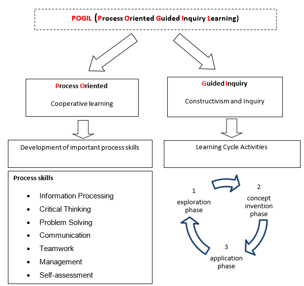 Learners bring into the classroom setting their ideas, concepts and prior knowledge about what is happening around them – all of which can make their learning easy or difficult (Chandran, Treagust, & Tobin, 1987; Lawson, 1983; Reynolds & Walberg, 1992). This prior knowledge the students bring forms the foundation of a constructivist approach because learning is the process of setting up associations between current knowledge and new instances of learning, and of integrating new knowledge with current knowledge, according to the constructivist approach (Brooks & Brooks, 1999; Perkins, 1999; Regis, Albertazzi, & Roletto, 1996). Yet, students’ prior knowledge comprises alternative conceptions, which do not usually overlap with scientific concepts. Therefore, in order for meaningful and sustainable learning to occur, it is necessary to change these alternative conceptions (Smith, Blakeslee, & Anderson, 1993). As students’ alternative conceptions are resistant to change, it is difficult to overcome the resistance using traditional teaching methods (Driver & Easly, 1978; Fisher, 1985; Hynd, McWhorter, Phares, & Suttles, 1994). As a result, conceptual change does not occur. For conceptual change to happen, it is recommended that approaches different from the traditional teacher-centred teaching approach could be used. One of the teaching methods that can help to change students’ alternative conceptions is Process Oriented Guided Inquiry Learning (POGIL). POGIL has emerged on the basis of the benefits of constructivism, inquiry and cooperative learning – which could enable students to participate actively in structuring and understanding their own created knowledge (Bransford et al., 2000; Farrell, Moog, & Spencer, 1999; Moog, Lewis, & Bunce, 2006; as cited in Simonson & Shadle, 2013) (see Figure 1).