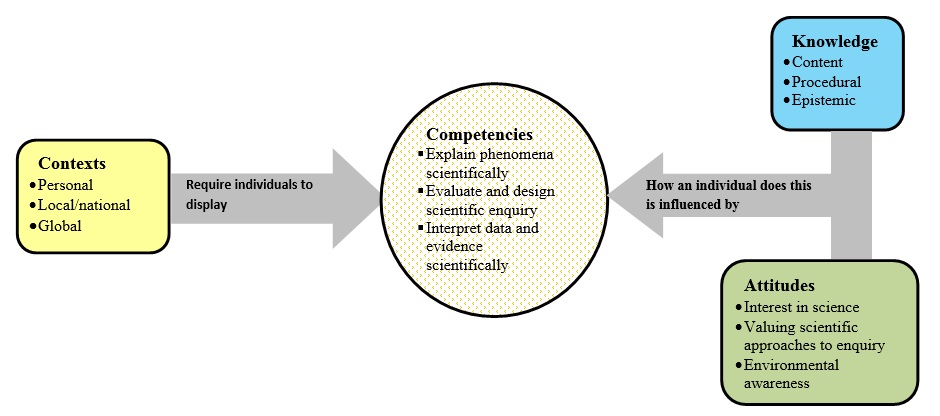In particular, according to science assessment of PISA 2015, scientific literacy may be characterized as consisting of four interrelated aspects, as shown in Table 2. In addition, Figure 2 depicts the framework of scientific literacy assessment more diagrammatically. In terms of context, the student should be able to recognize life situations involving science and technology by thinking personally, locally, and globally. Regarding competencies, students must be able to identify scientific issues, explain phenomena scientifically, interpret data and use scientific evidence. Turning to attitudes, students must perform well in supporting scientific inquiry, motivation, and act responsibly towards natural resources and environments.