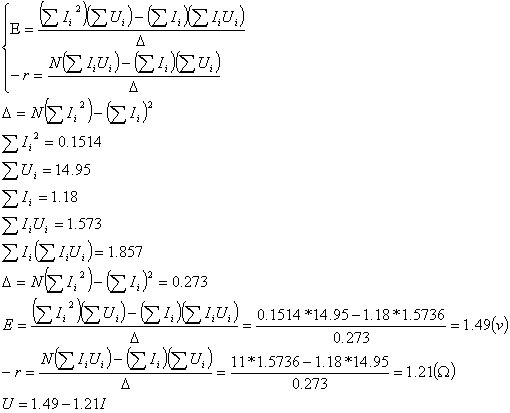 全電路的歐姆定律公式 E = U + I r, 可變形為 U = E - I r, E,r 為定值,U I為變數,滿足關係式 yi = A + B xi, E、-r 分別相當於係數A 、B, I 、U分別相當於xi、yi。在作"應用全電路的歐姆定律測電源的電動勢E和內阻r"的實驗中,(所測資料如下表),應用最小二乘法求E,r。