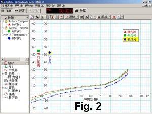 Then 2 curves of the infrared readings against the inner temperature readings and the surface temperature readings were plotted respectively as indicated below in Fig. 3. It can be seen that the 2 curves were very close to straight lines which implied linearity characteristic of the infrared thermometer. In both Fig. 1 and Fig. 2, the blue line stands for infrared thermometer reading. The red line stands for the surface temperature detected by Data Logger. The green line stands for the inner temperature detected by the second sensor of Data Logger. Judging from Fig. 1 and Fig. 2 the infrared detector exhibited a linear responding characteristic as that of the temperature sensor monitoring the surface of the iron mass except with a constant difference that seemed to be a calibration problem. Looking from the slopes of the curves in Fig. 3, we found that the Data-Logger sensor and IR thermometer were both acceptable for the purpose of our investigations despite exhibiting different linear thermal properties.