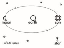 Figure 3. Earth-rotating heavens. Figure 4. A model with static Sun in its center. 4. Similar to results of previous studies (Nussbaum, 1979, 1985; Vosniadou, 1991, 1994), some students, in particular those with Earth-centered view, have difficulty in relating the flat Earth as viewed on the surface of the Earth to the spherical Earth as explained by other people. The difficulty gives rise to statements like “clouds are located (only) above the Earth”, and “people cannot live at the bottom of the Earth”. As well acknowledged, the idea of a flat Earth had been common among people in the ancient world.