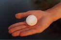 Locate one of the ping-pong balls to the center of the oval plate while placing the other to edge of the angular plate.