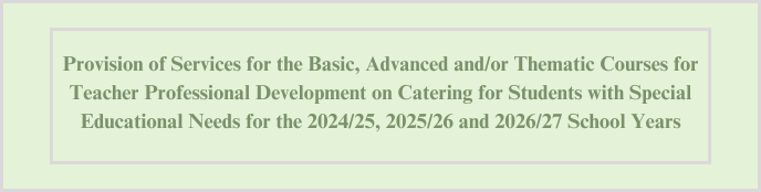 To enhance teachers’ professional capacity in catering for students with special educational needs (SEN), the Education Bureau (EDB) launched a teacher professional development framework on integrated education in the 2007/08 school year. Under this framework, a structured training programme pitched at three levels, i.e. Basic, Advanced and Thematic Courses (collectively named as BAT Programme), is conducted for serving teachers.
