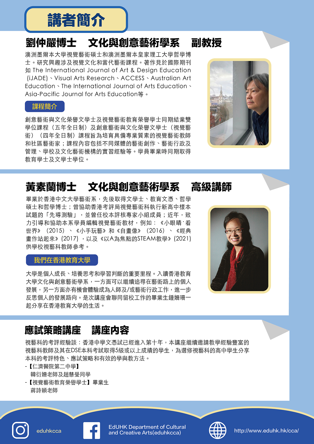 香港教育大学文化与创意艺术学系自2012年开始举办新高中视觉艺术科作品展览及讲座,为教师及学生提供一个交流平台,获得不少正面回响。为进一步拓展高中选修视艺科学生的视野,本系将举行一场线上讲座,针对不同的课题,为师生提供视觉艺术科之应试策略及升学资讯。讲座分为两部分,首部分为课程介绍及本系讲师专题短讲,次部分为中学视艺科老师及在DSE取得5级或以上成绩的学生分享心得。
