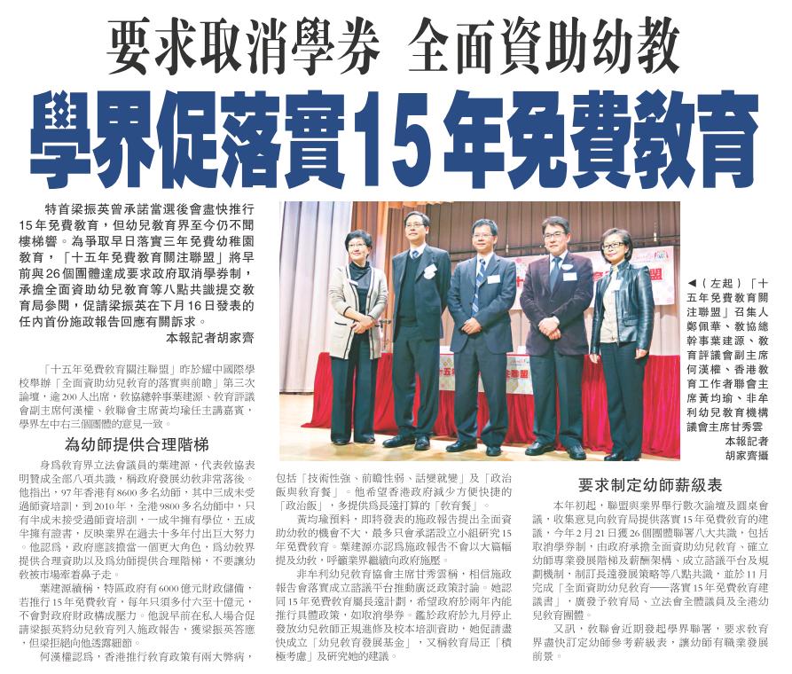 | 明報: 幼教八大訴求促梁落實 葉建源料施政報告無具體政策 【明報專訊】特首梁振英下月將發表任內首份《施政報告》,十五年免費教育關注聯盟昨提出八大訴求,要求梁兌現參選承諾,立即成立諮議平台共商幼教資助模式,制訂幼師薪級表等。三大教團教協、教聯及教評會代表昨出席論壇,教協立法會議員葉建源相信施政報告將列出資助幼教大原則,但教聯會主席黃均瑜估計政府不會公布具體政策。 15 年免費教育學者倡14/15 年落實 聯盟昨舉辦「全面資助幼兒教育的落實與前瞻」論壇,逾200 位幼稚園校長、教師及家長出席。聯盟召集人鄭佩華昨公布八大訴求(見表),包括要求制訂幼師薪級表等,並已獲26個團體聯署支持。另外,由教育學院學者成立的「15 年免費教育小組」亦公布具體建議書,建議政府先於2013/14 學年落實幼師薪級表,至2014/15 年全面落實15 年免費教育,長遠則應逐步設立質素保證機制。 按照建議書,日後幼師薪級表將參照現時中、小學教師薪級表設計。以一名新入職幼教文憑教師為例,現時一般薪酬約1 萬元,建議書則建議入職薪酬約1.6 萬元,比現時薪酬增加六成。 建議幼師薪酬增至1.6 萬 教協立法會議員葉建源表示,數星期前曾與特首梁振英會面,對方承諾會將15 年免費教育列入施政報告。不過他指政府工作進度令人失望,估計施政報告不會有具體細節,只會列出資助幼教大原則,以及成立諮議平台讓業界討論如何落實15 年免費教育。 不過,同場的教聯會主席黃均瑜卻不表樂觀,表示從各種傳言所知,施政報告不會就資助幼教提出原則或方向。他說: 「相信施政報告最多只會就資助幼教成立研究小組及跟進,不會有具體政策或方向。」 另外,教評會副主席何漢權亦批評政府落實15年免費教育進度緩慢,促請政府盡快推出具體政策。 教聯料梁不提原則方向 然而,不少與會者均不認同黃均瑜言論,教院教育政策與領導學系助理教授袁慧筠明言,業界應按照專業爭取盡快落實資助,不應受政治因素影響。非牟利幼兒教育機構議會主席曾甘秀雲亦透露,早前曾與教局會面,有信心下月成立諮議平台,又指當局正積極研究成立幼師發展基金。 十五年免費教育關注聯盟八大訴求 1. 取消學券制。參照現行中、小學資助模式,全面資助所有非牟利幼稚園 2. 正視全日制幼兒教育需要。教院學者建議全日制幼稚園學位單位成本,應比半日制多1 倍至1.6 倍 3. 降低師生比例。2 至4 歲班的師生比例應為1:10,4 至6 歲班為1:15 4. 優化人手編制。增設支援教師、會計文員及主任等職位,改善教師工作環境及協助教師應付行政工作 5. 訂立證書及學位教師的薪級表、向教師提供持續專業發展津貼 6. 推展本土化的教研工作。例如設立兒童成長發展的中央資料庫 7. 確立專業質素保證機制。包括發展自評文化、提高外評開放性和透明度 8. 以專業教育工作者為主導,設立具透明度的諮議平台及規劃機制,討論及共同議定幼教發展路線圖  十五年免費教育關注聯盟昨就落實15年免費教育提出八大訴求,並邀請三大教團出席論壇,圖左起為聯盟召集人鄭佩華、立法會議員葉建源、教評會副主席何漢權、教聯會主席黃均瑜及非牟利幼兒教育機構議會主席曾甘秀雲。(盧翊銘攝) FROM: http://news.mingpao.com/20121211/gfa1.htm |