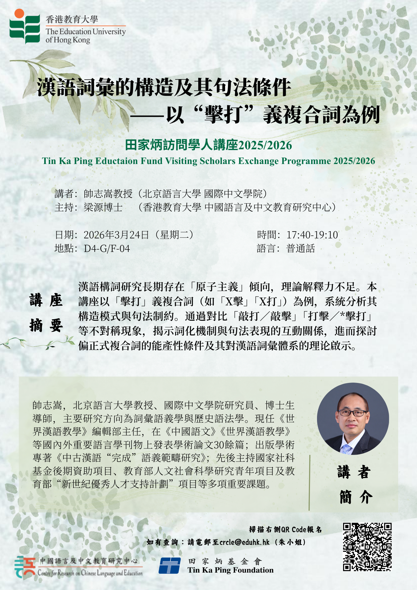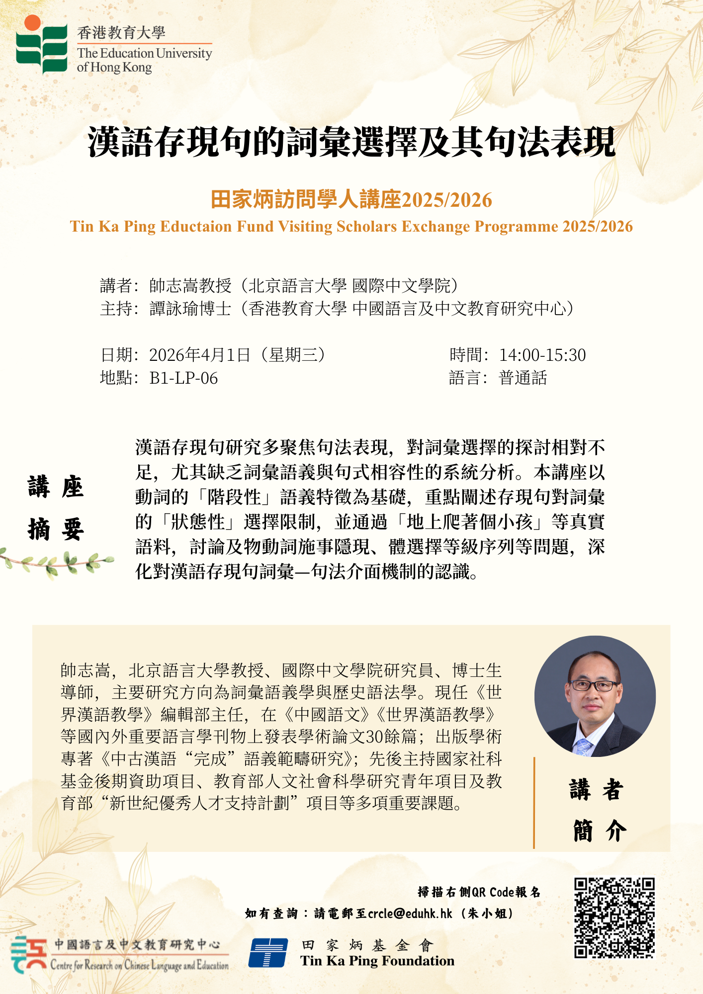 應香港教育大學中國語言及中文教育研究中心(下稱「中心」)邀請,北京語言大學(下稱「北語」)帥志嵩教授在田家炳基金會資助下,於2026年3月20日至4月2日到訪教大,進行為期兩週的學術交流。