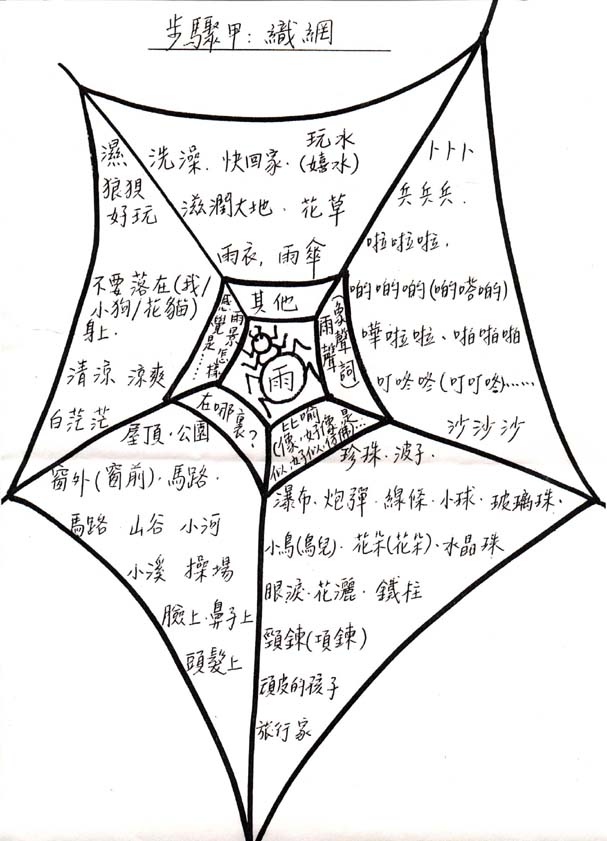 在一次參加英文教學的短期課程中,導師講述vocabulary building的環節時,介紹了一種叫words spider的方法,以幫助學生造句及作文。於是我便聯想到運用於中文寫作的可行性。首先選擇了詩歌創作為目標。將上述意念改良,使過程趣味化:把蜘蛛及蜘蛛網具體形象化畫出,詞彙則疊織成一個蛛網,並分門別類,以方便學生進入第二階段時,寫作有步驟依循。
