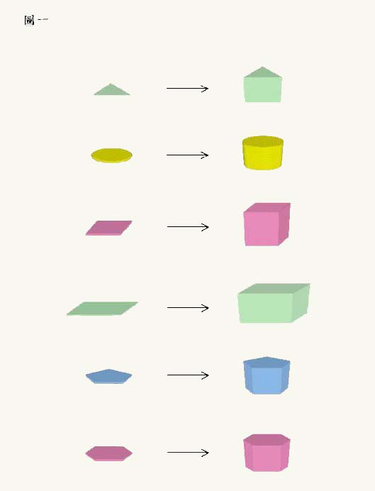 因同學都親眼目睹平面變成柱體的過程,他們都能清楚理解到柱體的頂部和底部是相同的,三角形變成三角柱體、圓形變成圓柱體等。