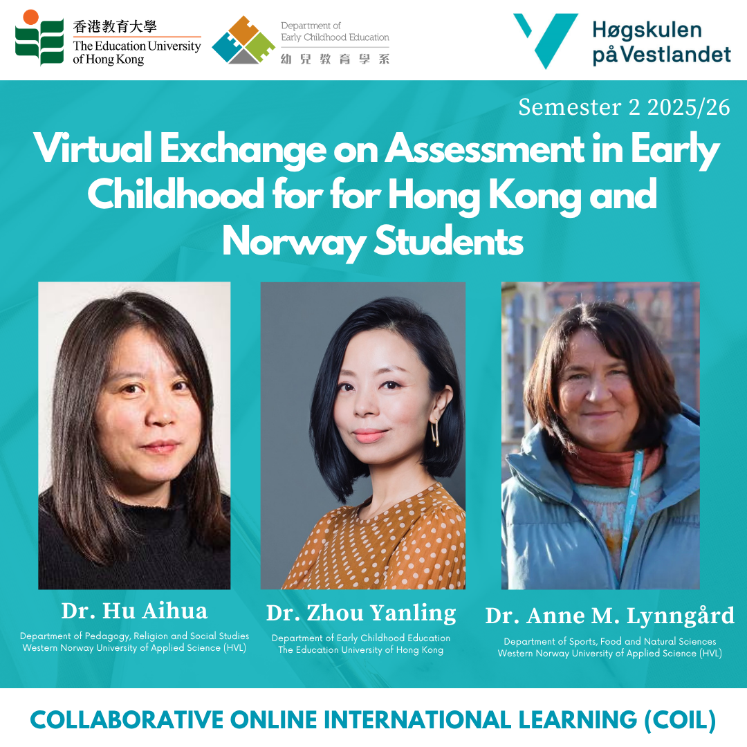 The collaborative session was co-designed by Dr. Zhou Yanling, Area Coordinator of the Master of Education (Early Childhood Education) Programme at EdUHK, together with Dr. Hu Aihua and Dr. Anne Myklebust Lynngård from HVL. Supported by Teaching Assistant Ms. Wendy Chan Wan Ting and COIL Facilitator Ms. Sofie Chua, the international team began planning the initiative in December 2025.