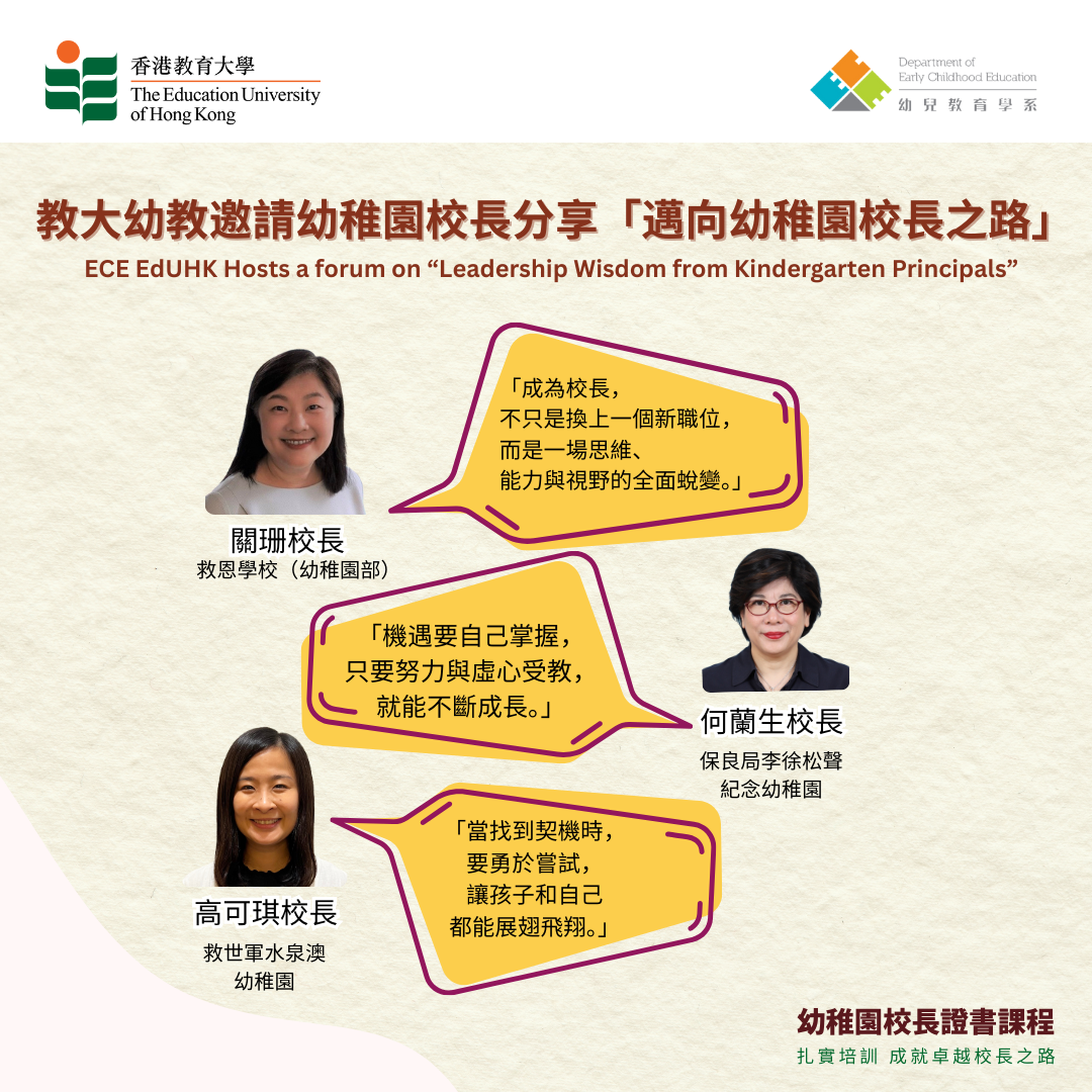 The Department of Early Childhood Education at The Education University of Hong Kong (EdUHK) invited three local kindergarten principals to share their experiences and leadership insights on an online forum titled "Leadership Wisdom from Kindergarten Principals", which was held on 10 Oct 2025.