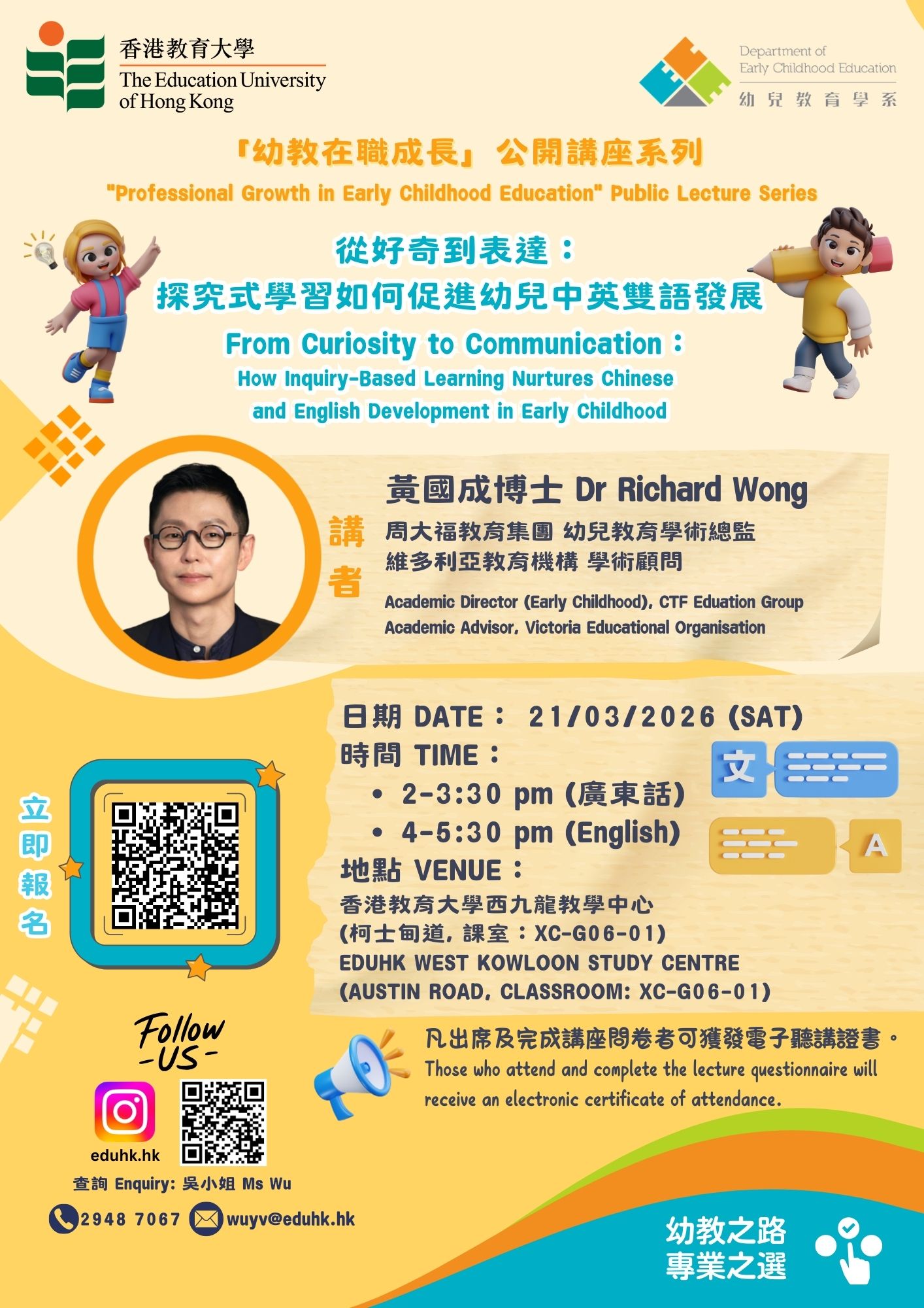 The lecture is particularly suitable for both pre-service and in-service ECE educators, supporting them to strengthen professional judgement and classroom practice through more systematic design of questioning, dialogue, and extension activities, and to build a “Curiosity–Exploration–Expression” learning pathway so that children can naturally enhance bilingual comprehension and expression in meaningful inquiry contexts.