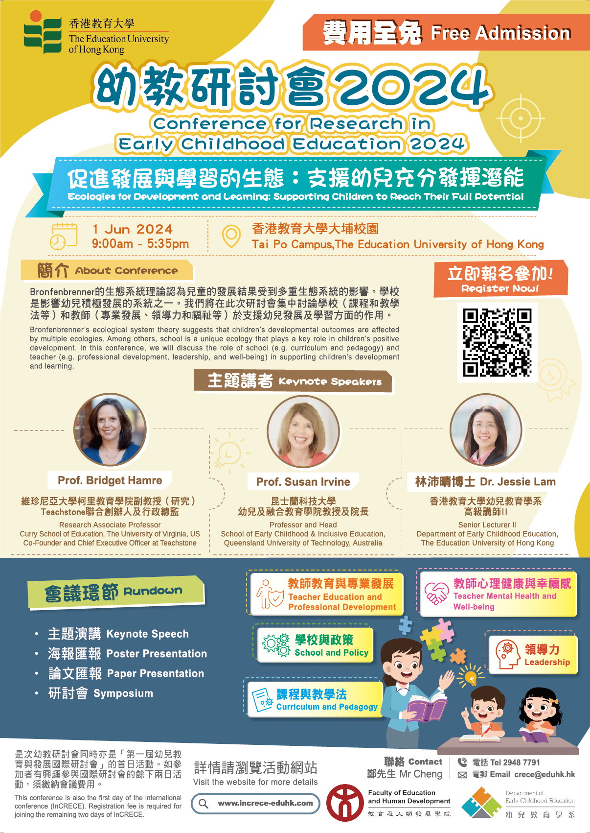The conference will take place on June 1, 2024, from 9:00 am to 5:35 pm. The theme of this year's conference is "Ecologies for Development and Learning: Supporting Children to Reach Their Full Potential", aligning with Bronfenbrenner's ecological system theory, which emphasizes the impact of various ecologies on children's developmental outcomes. Our focus will be on exploring the crucial role of schools (e.g., curriculum and pedagogy) and teachers (e.g., professional development, leadership, and well-being) in fostering positive development and learning experiences for children.