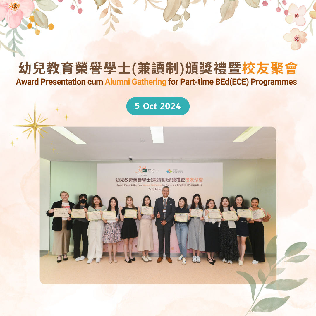 The Department of Early Childhood Education held the "Award Presentation cum Alumni Gathering for Part-time BEd(ECE) Programmes" on October 5, inviting awardees of the "Project/Capstone Course Excellence Award Recipients for Bachelor of Education (Early Childhood Education) Programmes" and the "Outstanding Field Experience Award for Early Childhood Education Students", along with their friends and relatives, to return to the Tai Po campus.