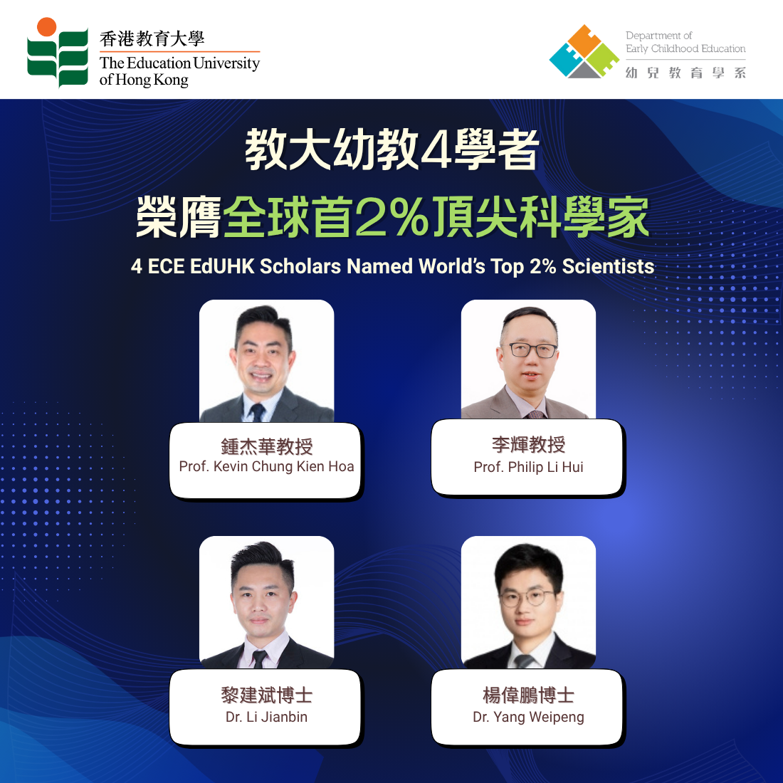 美國史丹福大學最近公布2025年全球頂尖2%科學家名單,香港教育大學共有54名學者上榜,較去年49人增加5人。其中,來自香港教育大學幼兒教育學系的學者有四位,按英文姓氏字母順序分別為:鍾杰華教授(教育)、李輝教授(教育)、黎建斌博士(社會心理學)和楊偉鵬博士(教育),而當中有3位學者屬教育範疇,亦反映教大幼教喺教育,以至幼教領域的領先地位。