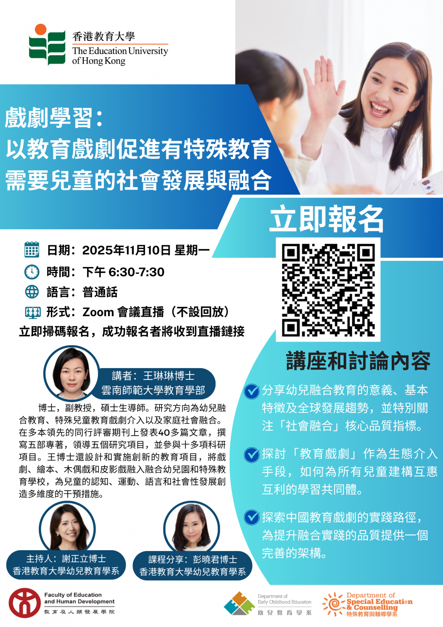 本次講座將闡明幼兒融合教育的意義、基本特徵和當前的全球趨勢,並特別關注「社會融合」這項核心品質指標。我們將探討「教育戲劇」作為生態介入手段,如何為所有兒童建構互惠互利的學習共同體。本場講座也將探索一條因地制宜的教育戲劇在中國的路徑,為提升融合實踐的品質提供一個完善的架構。