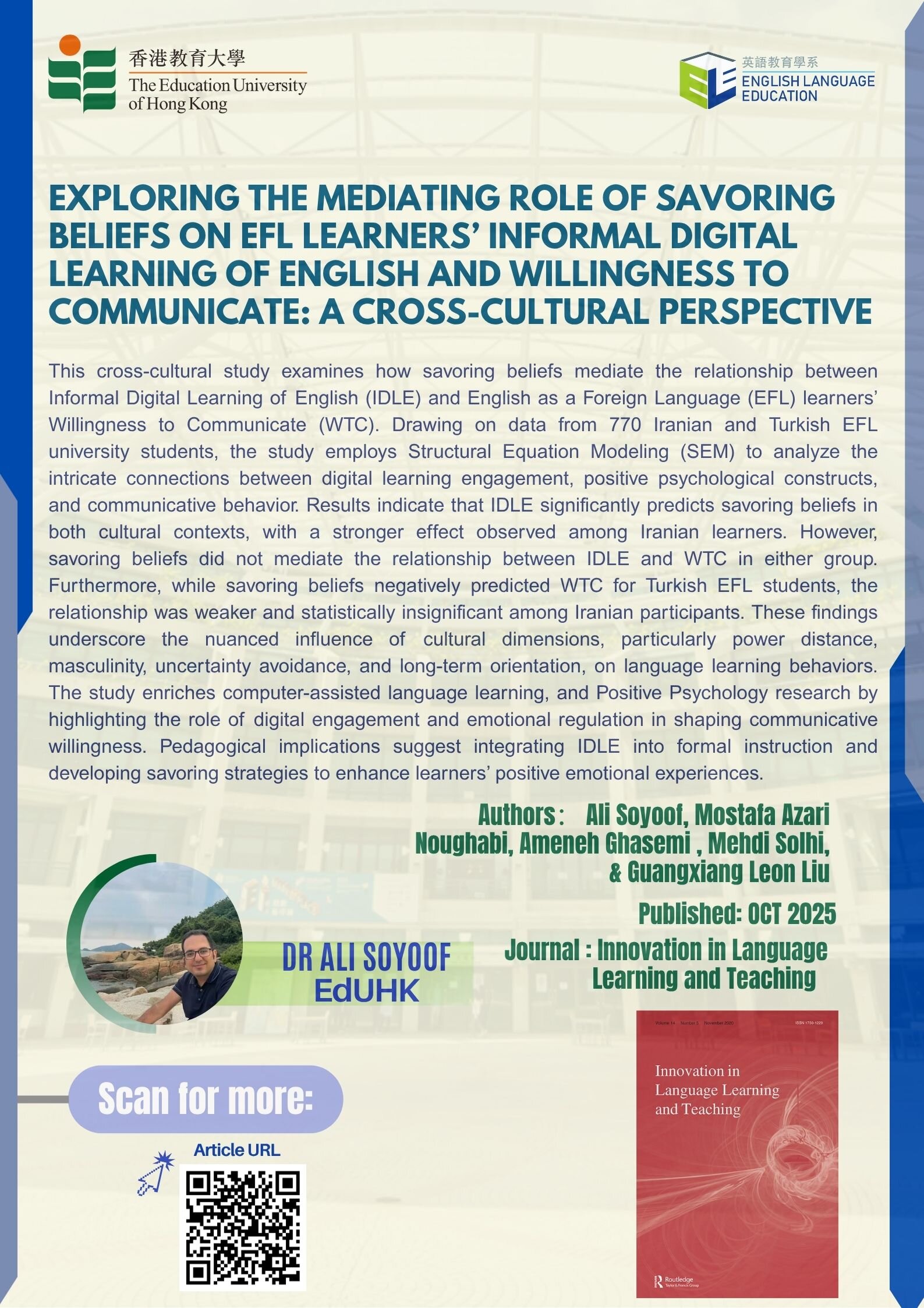 - Ali Soyoof, Mostafa Azari Noughabi, Ameneh Ghasemi , Mehdi Solhi, & Guangxiang Leon Liu (2025). Exploring the mediating role of savoring beliefs on EFL learners’ informal digital learning of English and willingness to communicate: a cross-cultural perspective https://www.tandfonline.com/doi/full/10.1080/17501229.2025.2554862