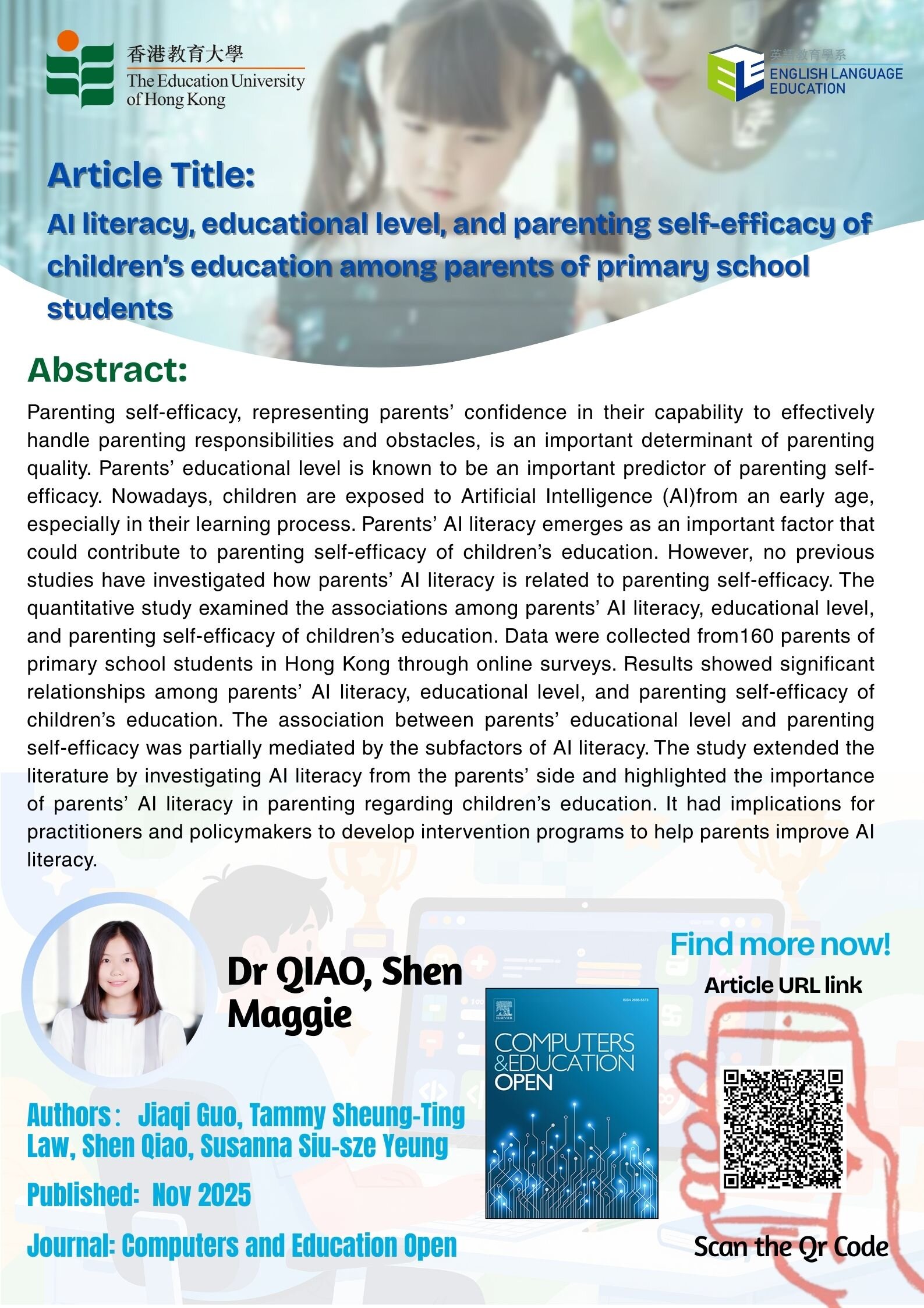- Guo, J., Law, T. S.-T., Qiao, S., & Yeung, S. S.-S. (2025). AI literacy, educational level, and parenting self-efficacy of children’s education among parents of primary school students. Computers and Education Open, 9, Article 100318. https://doi.org/10.1016/j.caeo.2025.100318