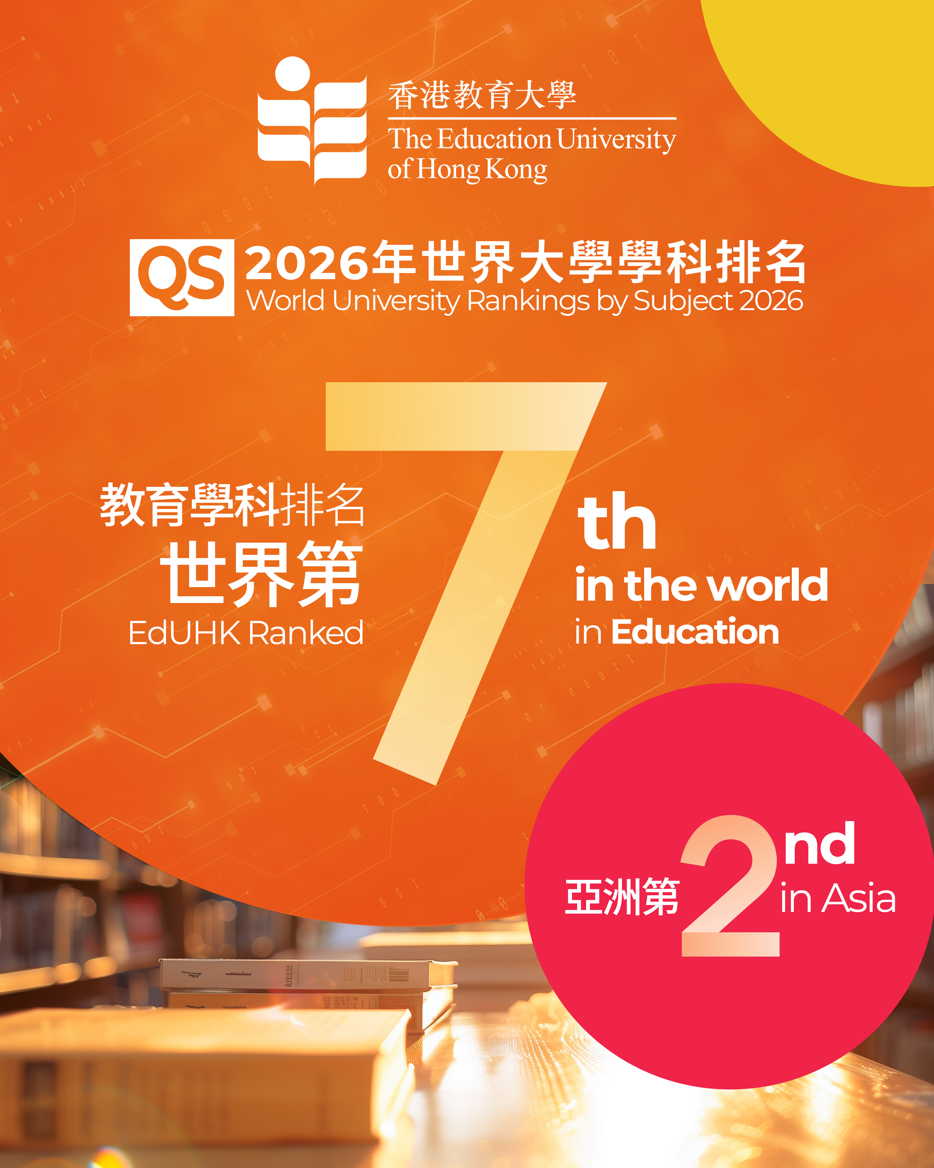 The Education University of Hong Kong (EdUHK) is pleased to announce today (25 March) its latest results in the QS World University Rankings by Subject 2026, where it has been ranked 7th worldwide in Education and 2nd in Asia. This best-ever performance marks a historic milestone for the University, reflecting sustained progress over three consecutive years and affirming its international standing in the field of education, with strong recognition from the global academic community.