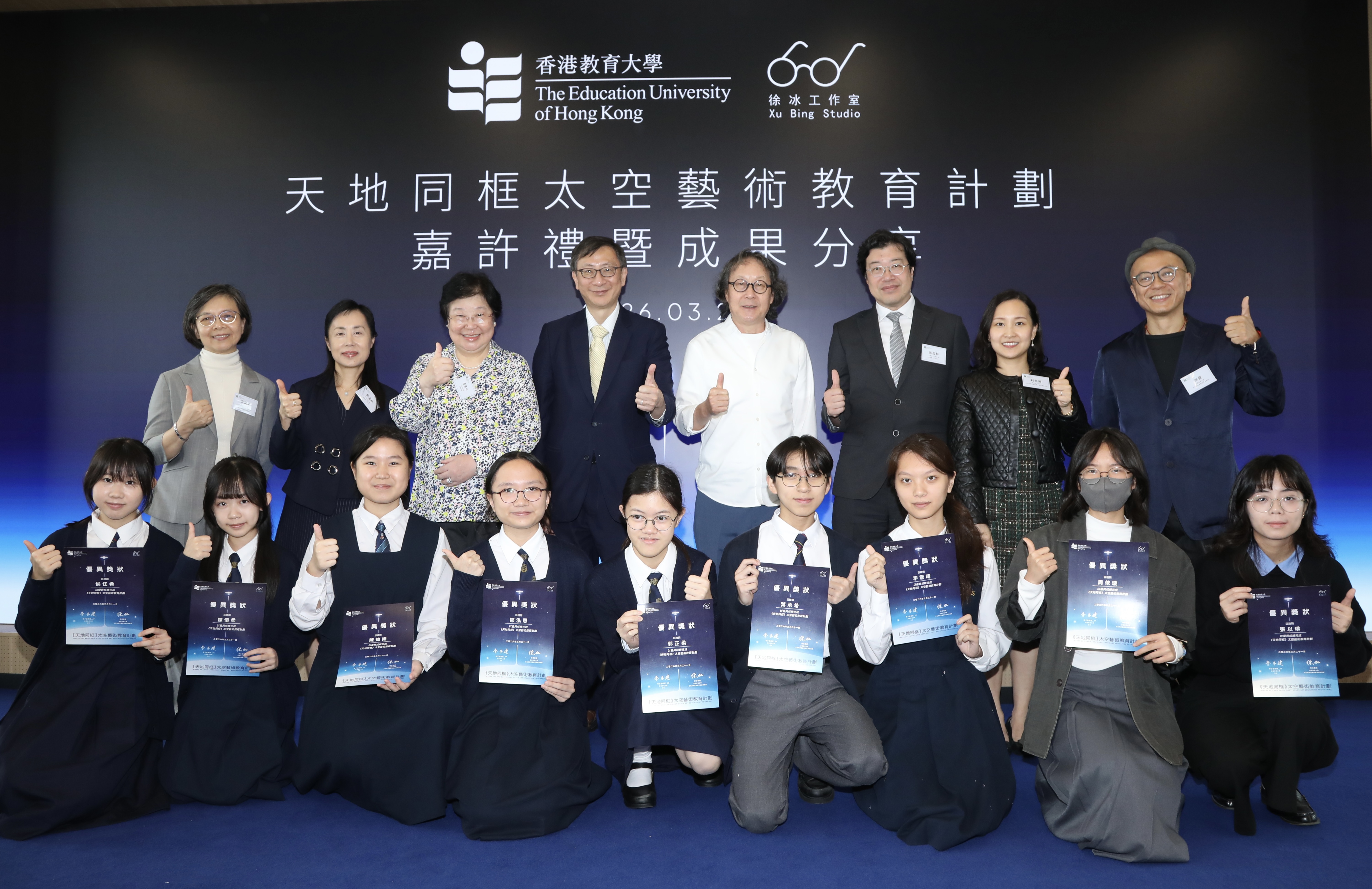 The Education University of Hong Kong (EdUHK) has partnered with world-renowned artist and EdUHK Visiting Professor Xu Bing and his studio to launch the ‘Where Sky and Earth Meet’ Space Art Education Programme. Earlier this year, six student-created digital artworks were transmitted to the ‘SCA-2’ art satellite, showcasing Hong Kong students’ imagination in space for the first time. A recognition ceremony was held on 21 March at EdUHK’s West Kowloon Centre (Museum Drive), alongside a public exhibition of 20 outstanding and shortlisted works.