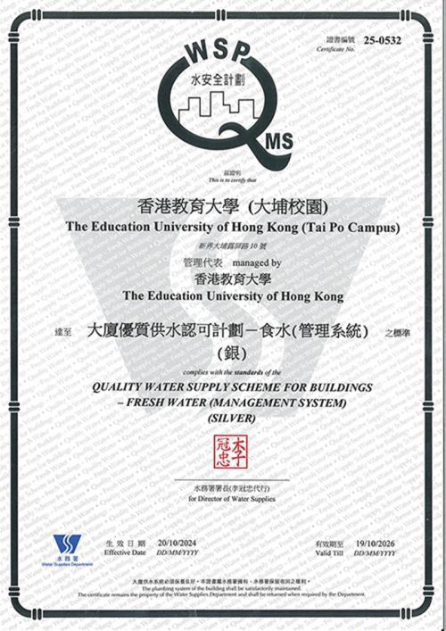 Furthermore, EdUHK is committed to ensuring high standards of drinking water quality. Since 2020, we have participated in the Quality Water Supply Scheme for Buildings – Fresh Water (Management System) initiated by the Water Supplies Department. This initiative underscores our dedication to executing comprehensive water safety plans and maintaining the integrity of our internal plumbing systems, thereby safeguarding the health and well-being of our students, staff, and visitors.