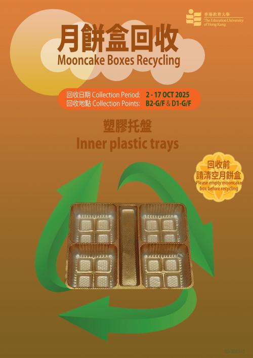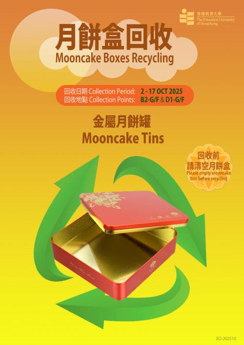 After the Mid-Autumn Festival, there are probably some empty mooncake boxes left at your homes. Instead of disposing of them into the landfills, please consider upcycling the boxes, such as transforming them into storage boxes. Another green alternative is to recycle them. Two mooncake box recycling points at B2-G/F and D1-G/F are set up between 2nd and 17th October 2025 for collecting unwanted mooncake tins/paper boxes as well as inner plastic trays.