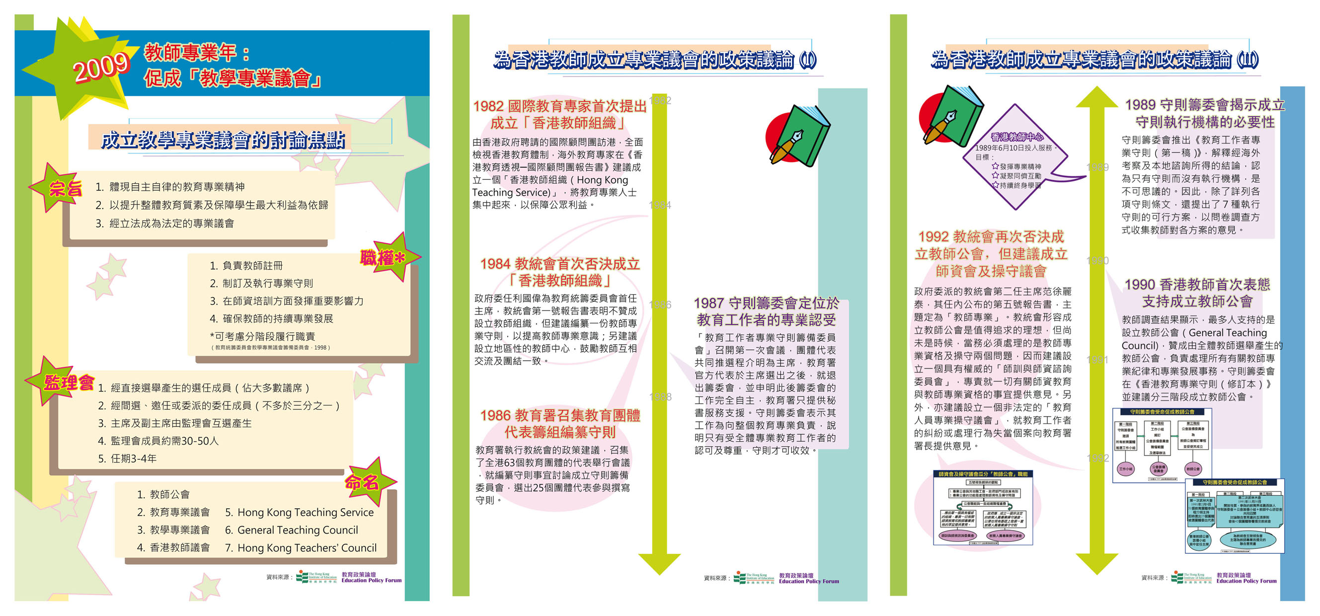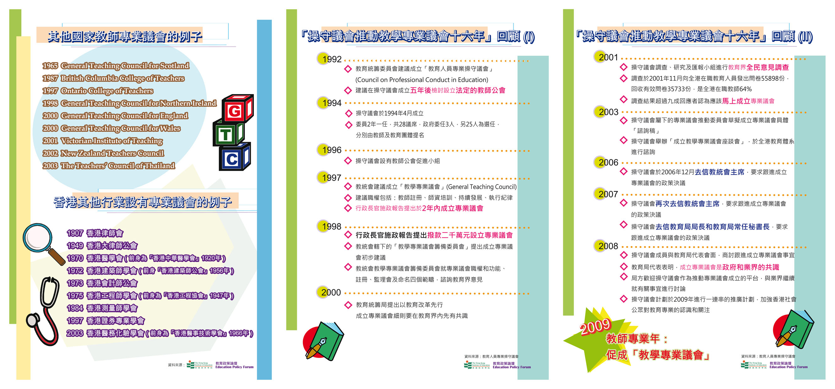 >> 小冊子頁二 - 「操守議會推動教學專業議會十六年」回顧 (i) - 「操守議會推動教學專業議會十六年」回顧 (ii) - 其他國家教師專業議會的例子、香港其他行業設有專業議會的例子