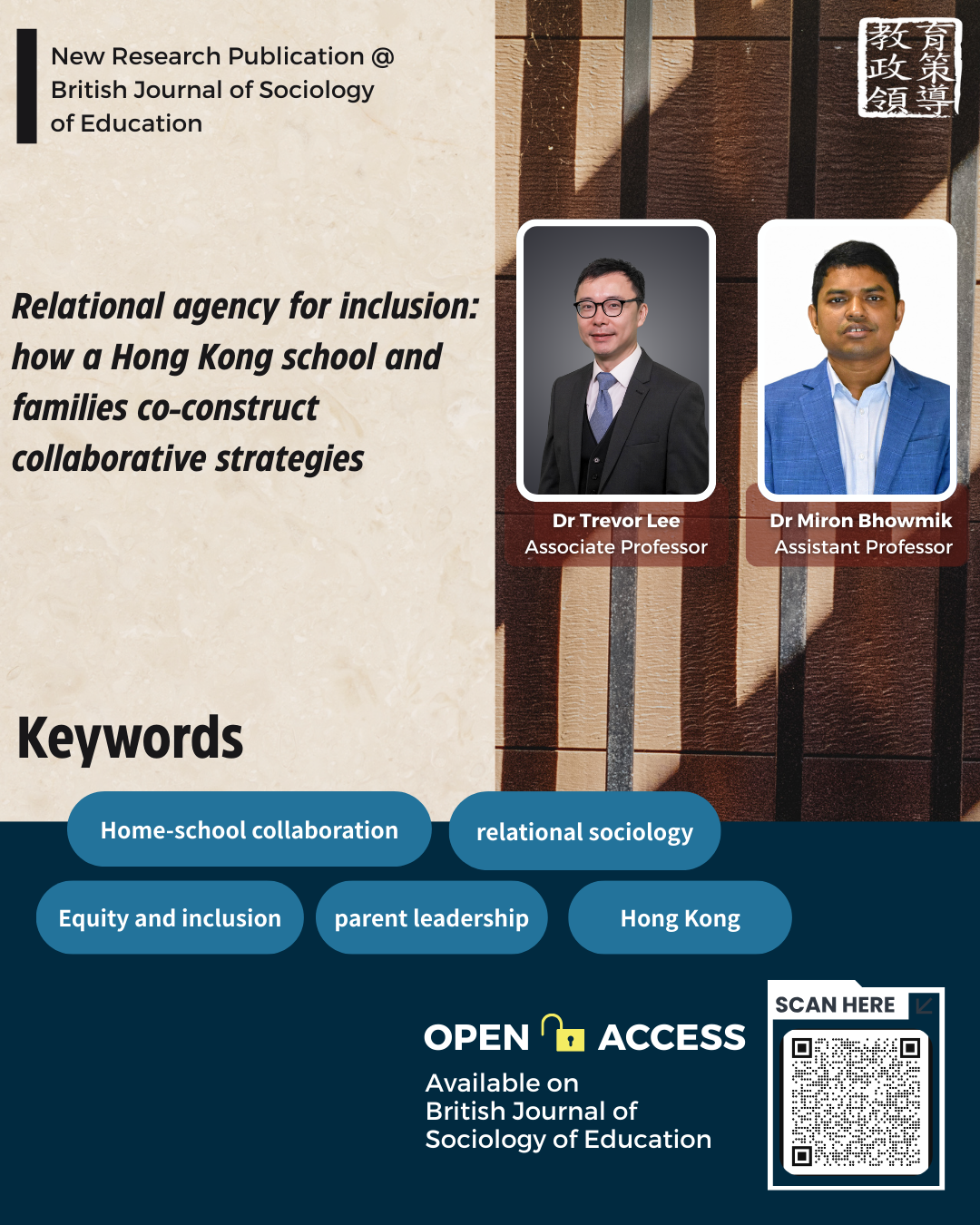 We would like to extend our congratulations to Dr Trevor Lee, Associate Professor of the Department of Education Policy and Leadership, of his latest publication titled "Relational agency for inclusion: how a Hong Kong school and families co-construct collaborative strategies", co-authored with Dr Miron Kumar Bhowmik, Assistant Professor at the Department of Education Policy and Leadership, in British Journal of Sociology of Education. Abstract This article explores the intersecting perspectives of school and parent leaders in fostering home-school collaboration at a socioeconomically diverse primary school. Grounded in relational sociology, the study examines how collaborative strategies develop through relationships, focusing on intersubjectivity, reciprocity, and emotional bonding. We conducted a qualitative case study comprising semi-structured interviews with school leaders and parents supplemented by observational notes and follow-up participant-shared digital content. Thematic analysis revealed four key strategies: (i) flexible scheduling to accommodate working parents; (ii) culturally responsive practices such as creating translated materials and multicultural events; (iii) fostering parental leadership and volunteerism; and (iv) community collaborations like NGO partnerships and peer-support programs to address systemic barriers faced by families of children with special educational needs. The findings highlight the importance of mutual trust and shared decision-making as relational achievements, showing how relational agency enables schools and families to jointly address structural barriers.