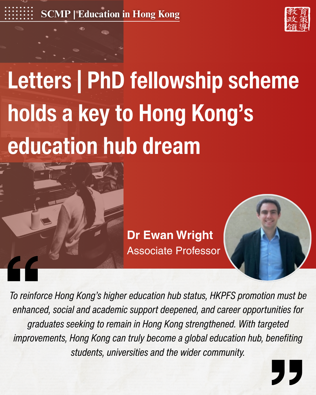 Dr Ewan Wright’s letter, “PhD fellowship scheme holds a key to Hong Kong’s education hub dream,” has been published in the South China Morning Post. Dr Wright discusses how attracting top international talent through the Hong Kong PhD Fellowship Scheme (HKPFS) can unlock Hong Kong’s potential as a world-class higher education hub.
